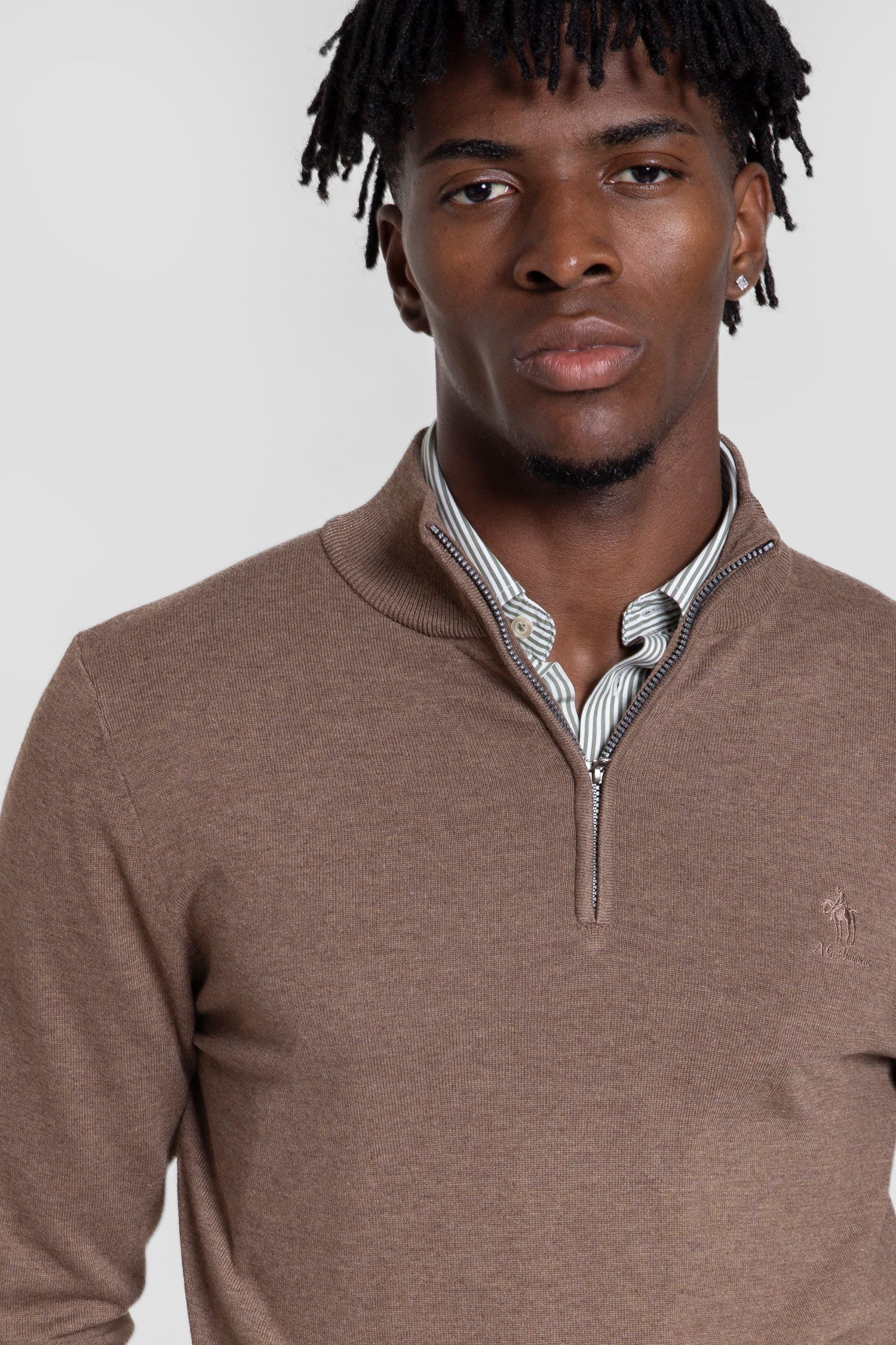 Este jersey de cuello cremallera en color marrón, parte de la línea Raíces de A LA VAQUERA, se presenta como una prenda básica y atemporal. Su tejido lo convierte en una opción perfecta para el otoño o para combinar con una camisa, ofreciendo versatilidad y comodidad en cualquier ocasión. Diseñado para adaptarse a todo tipo de estilos, este jersey aporta elegancia discreta y funcionalidad en el día a día.