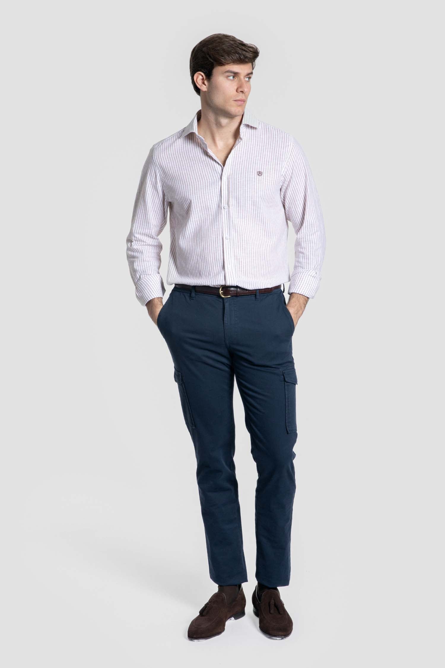 Camisa de rayas en tonos camel con escudo bordado a juego, diseñada para colecciones de moda versátil. Corte clásico que combina con cualquier base de armario, ideal para tiendas que buscan prendas de calidad con detalles distintivos. Perfecta como pieza clave para propuestas casuales y smart-casual.