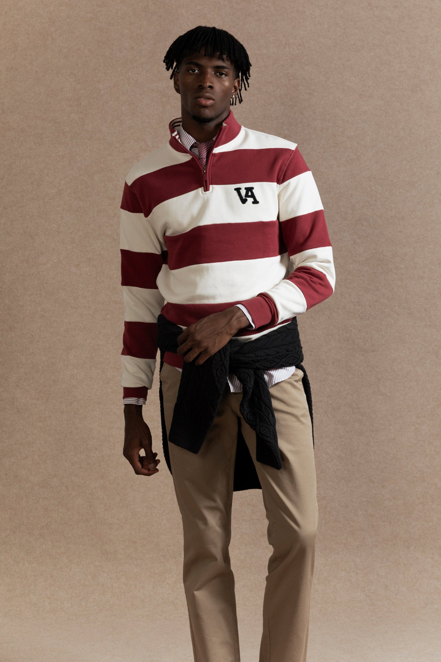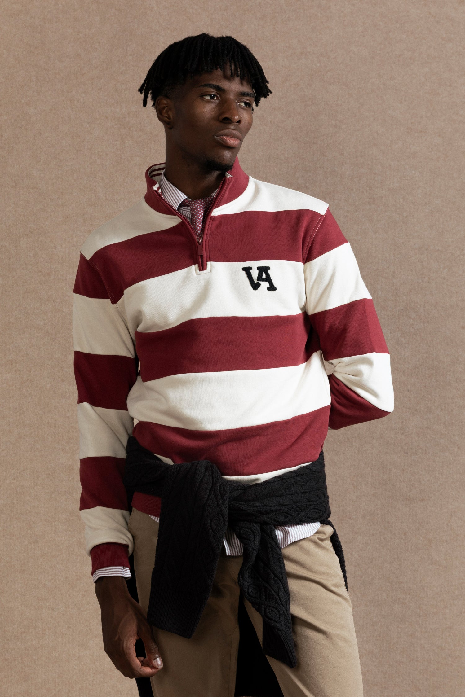 Esta sudadera en color burdeos y con raya arena combina estilo y comodidad gracias a su cremallera en el cuello que facilita su ajuste. Fabricada en tejido 100% algodón, ofrece una sensación suave y transpirable, ideal para uso diario o actividades casuales. Su diseño funcional y colores neutros aportan versatilidad para combinar con diferentes prendas.