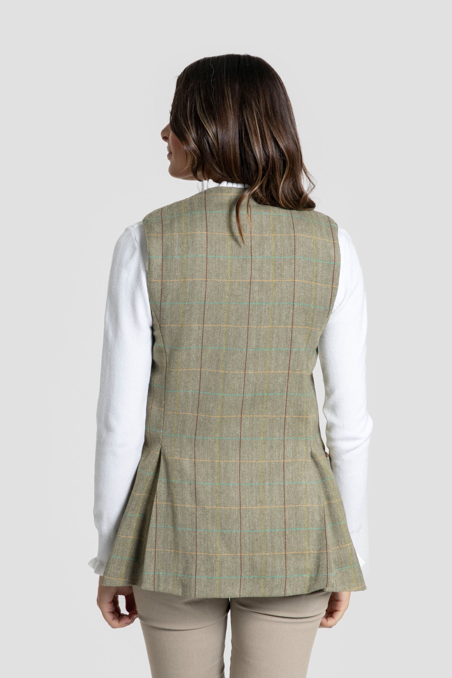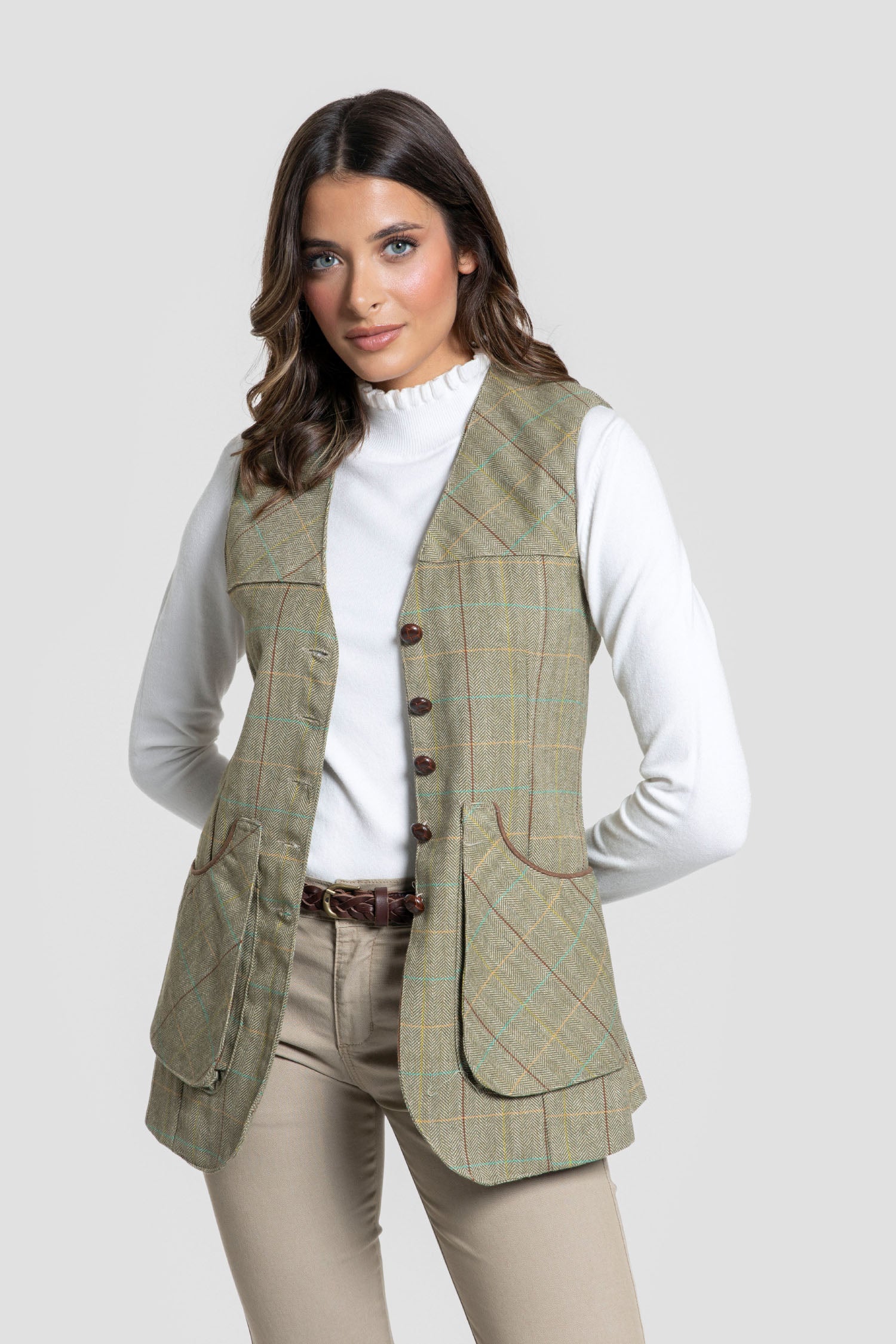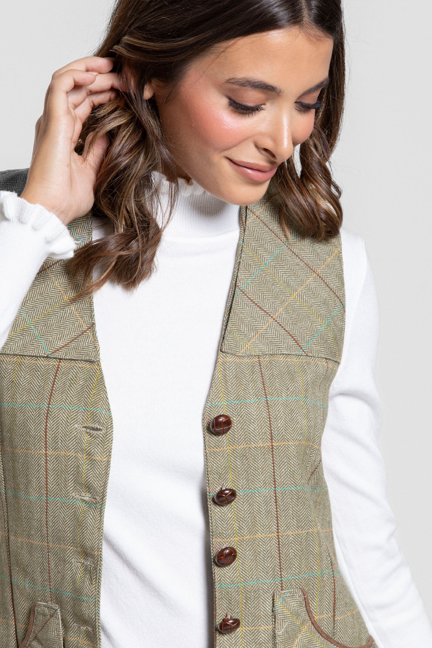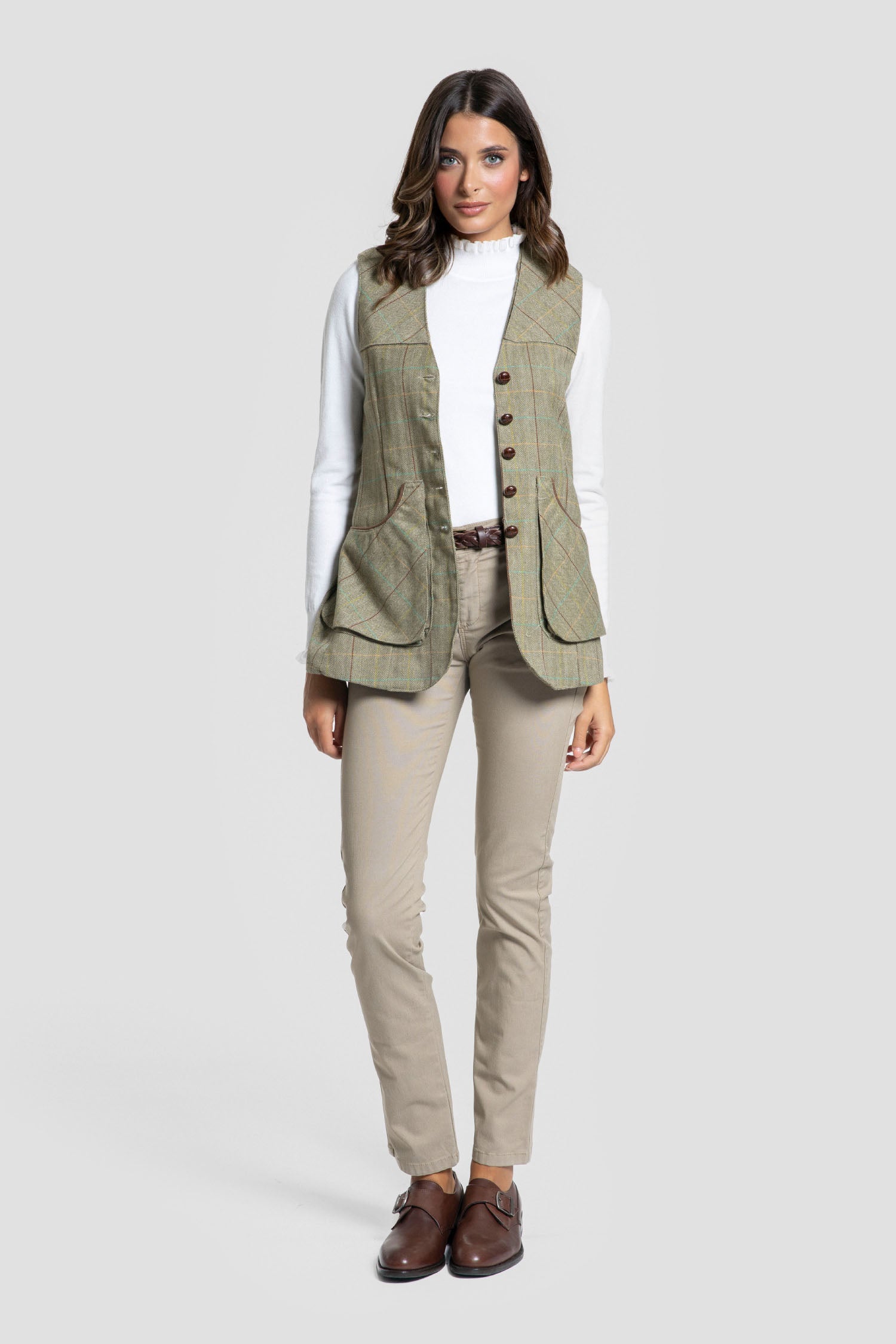 Chaleco femenino en tono kaki, diseñado con una funcional apertura frontal mediante botones y un favorecedor cuello en V que estiliza el torso. Su corte estructurado y color versátil lo convierten en una pieza fundamental para transiciones de temporada, aportando un toque de sofisticación militar-chic a cualquier conjunto.